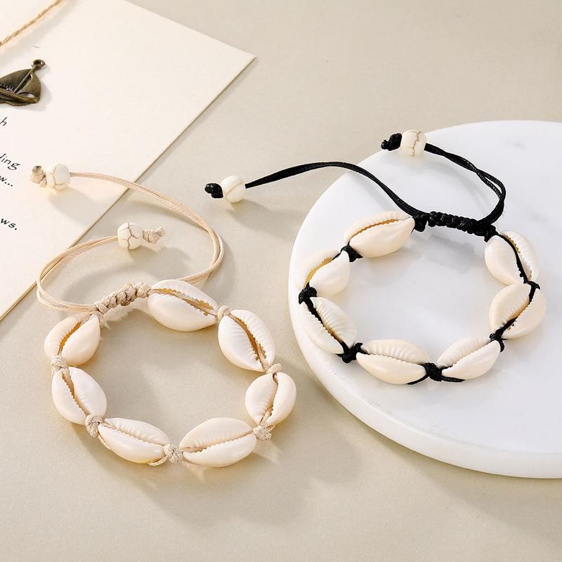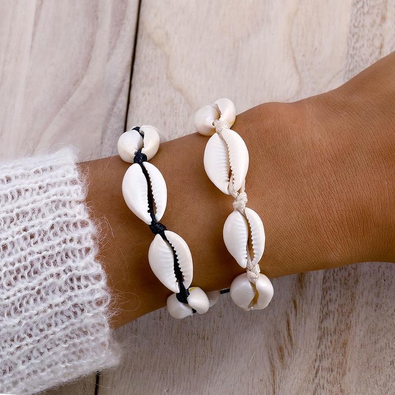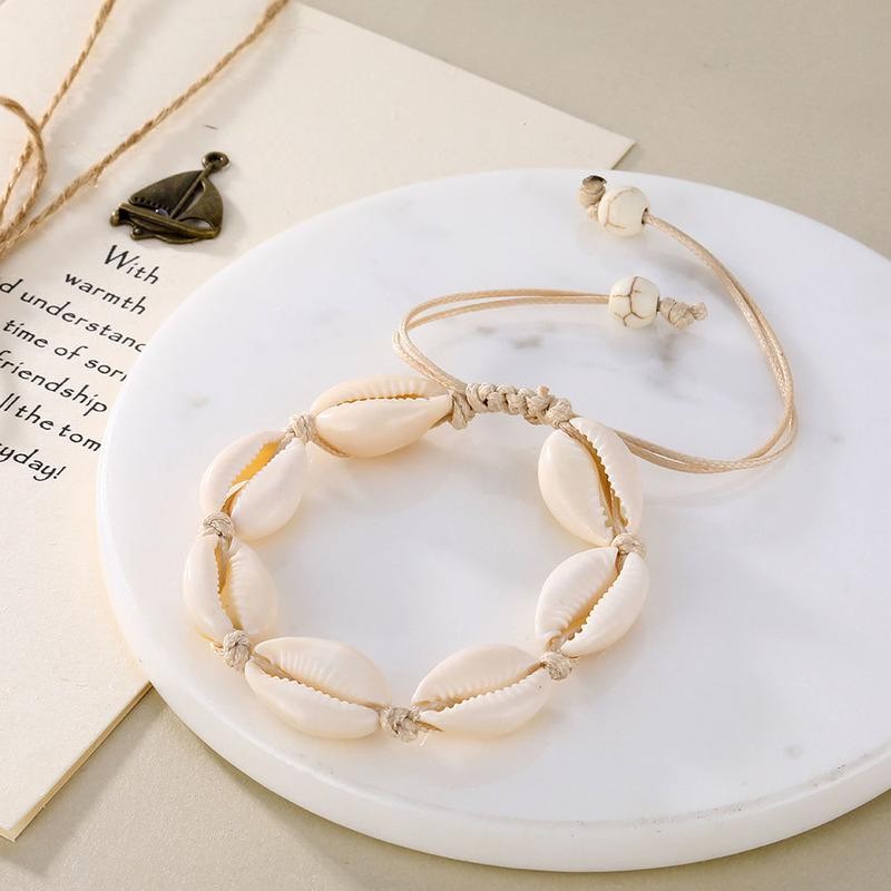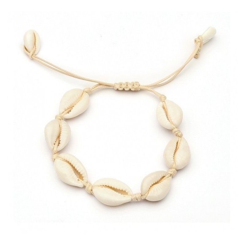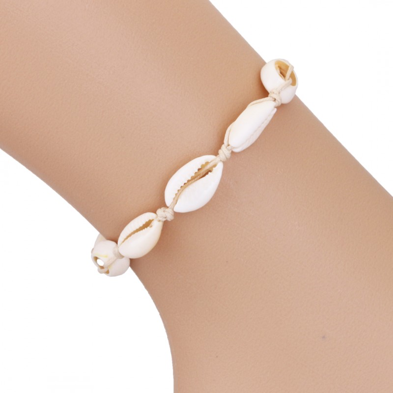 Bransoletka z muszelkami na rękę lub stopęBransoletka z regulacjąCena dotyczy jednej sztuki Wykonana ze stopu metali nieszlachetnychNie zawiera niklu ani chromu
