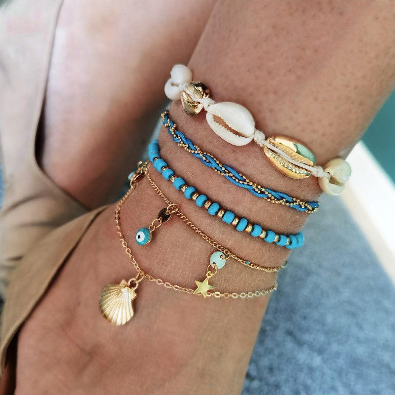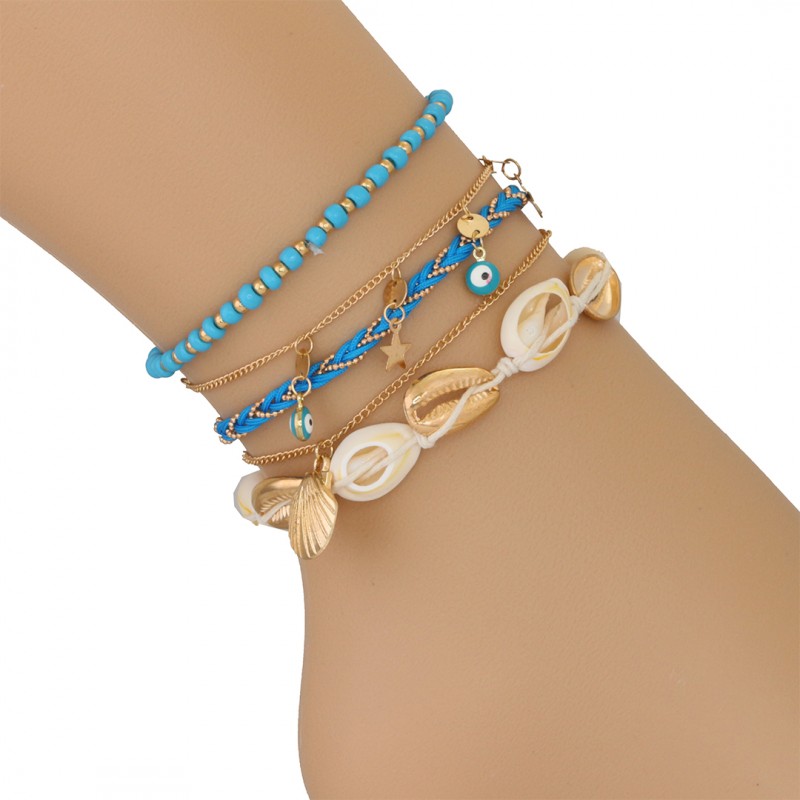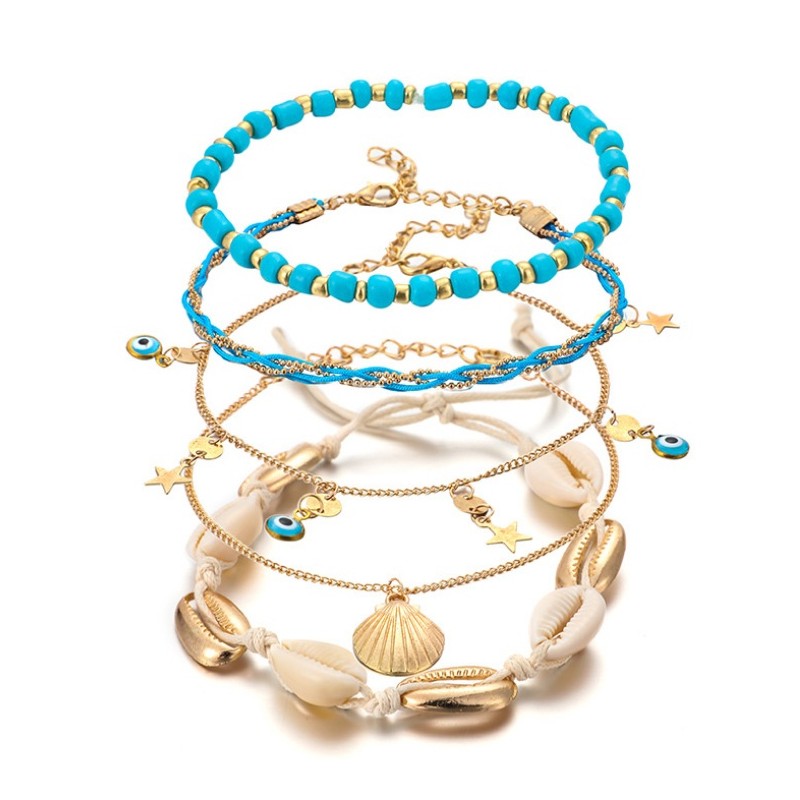 Bransoletka na stopę 5w1 złota koraliki niebieskie B496
