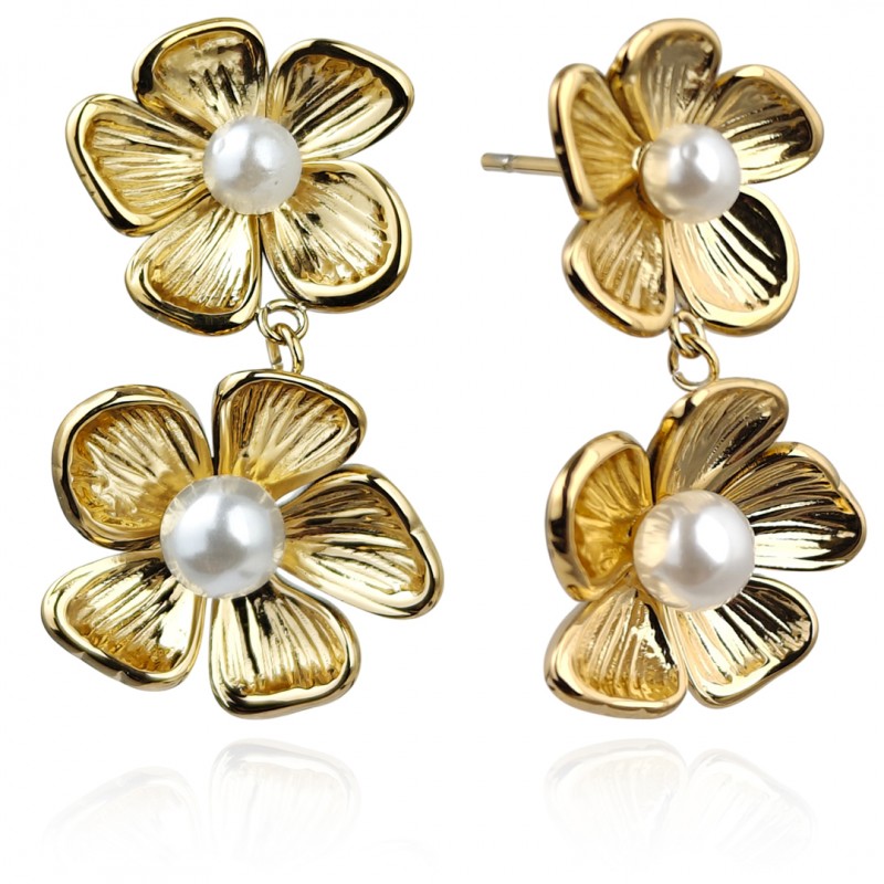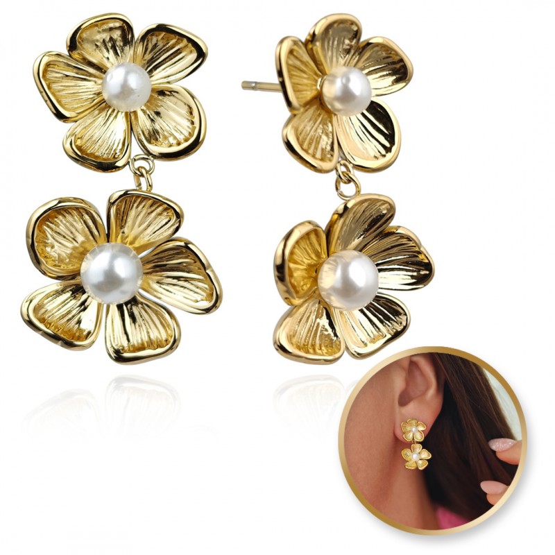 Kolczyki ze stali szlachetnej platerowane 14k złotem KWIATY perły KST3379