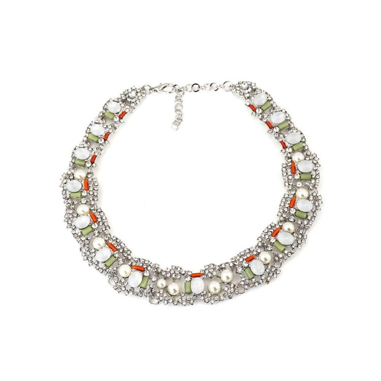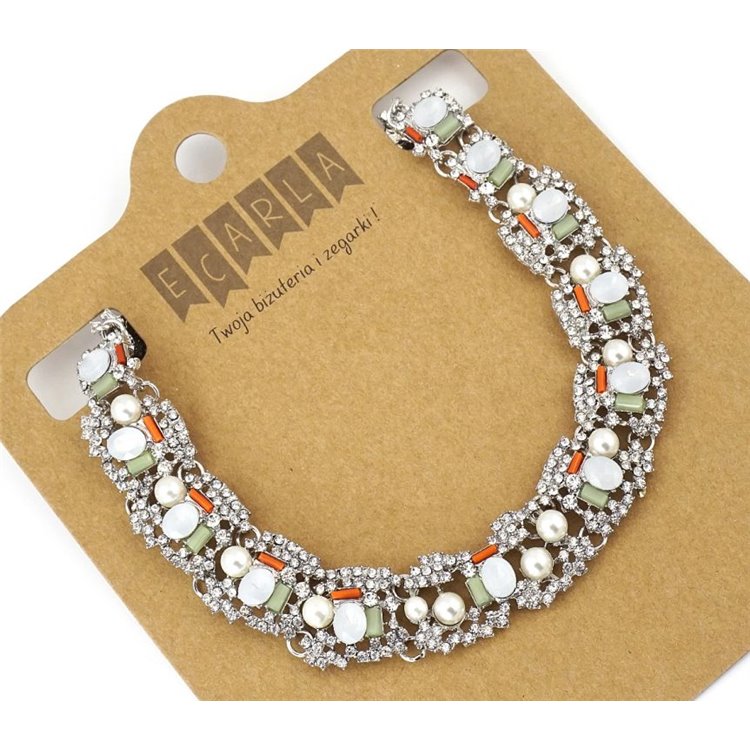 Kolia w kolorze srebrnym, bogato zdobiona białymi kryształkami oraz perłami i cyrkoniami.