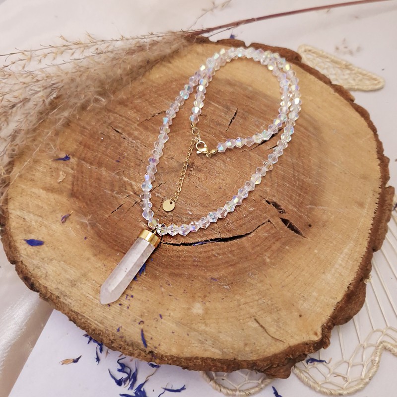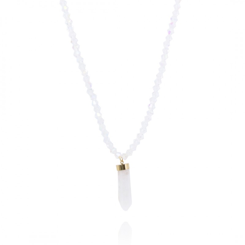 Modny naszyjnik ze stali szlachetnej platerowanej 14 – karatowym złotem z kryształem górskim Świetnie pasuje do eleganckich, jak również do codziennych stylizacji.