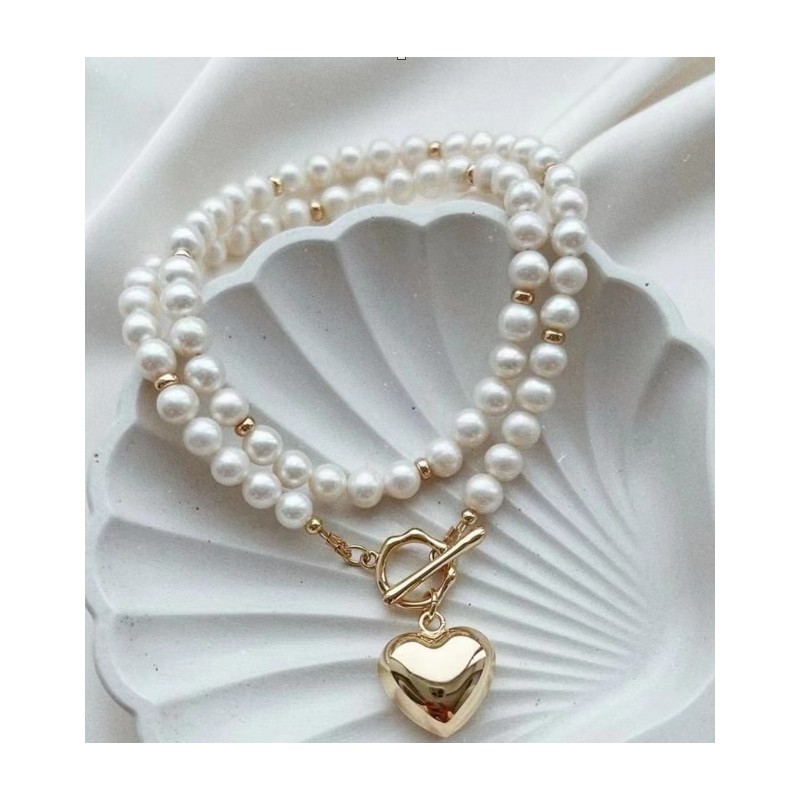 Naszyjnik perełki z sercem stal szlachetna pozłacana 14k złotem NST2110