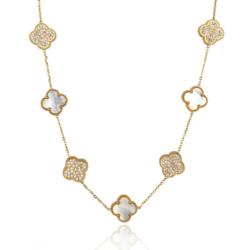 Naszyjnik stal szlachetna pozłacana 14k złotem, koniczynki, masa perłowa, cyrkonie NST2175