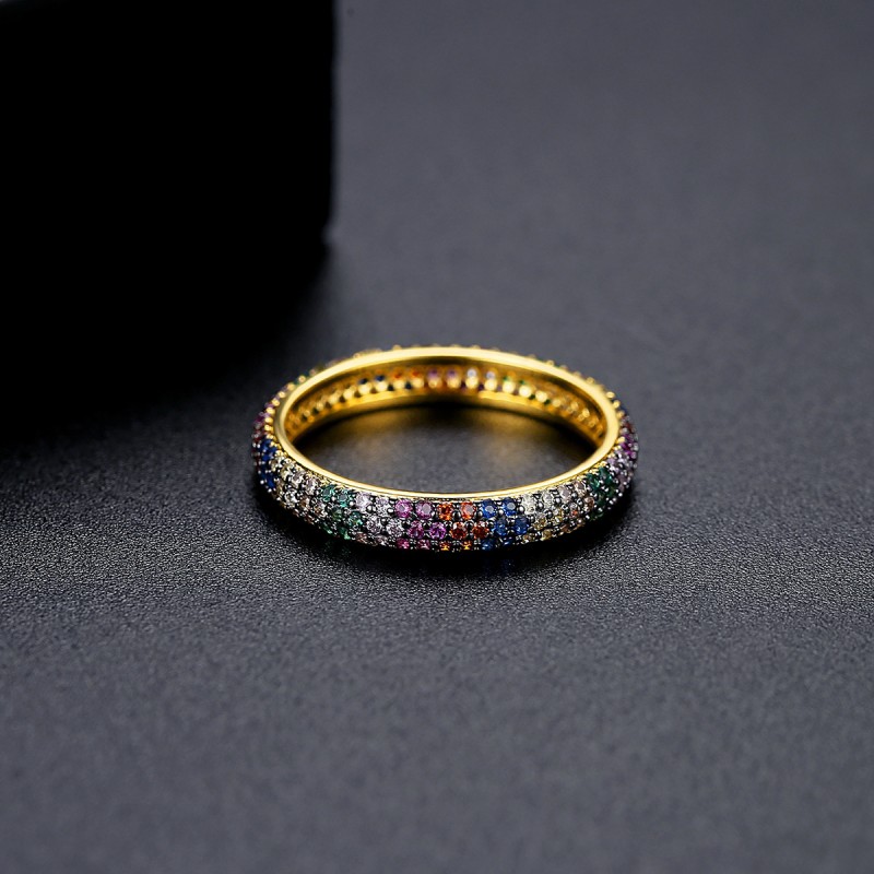 PLATEROWANY 18 karatowym złotem pierścionek ze stali szlachetnej Kolor: złoty z kolorowymi cyrkoniami STAL NIERDZEWNA jest odporna na warunki atmosferyczne, nie ulega korozji, nie rdzewieje, nie śniedzieje.