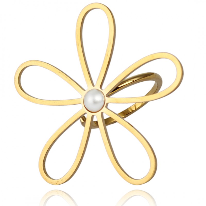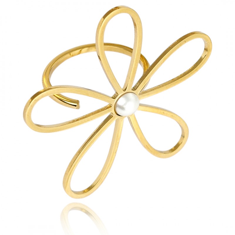 Pierścionek stal chirurgiczna platerowana złotem regulowany, KWIAT perła PST938