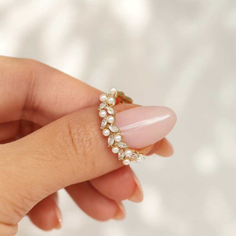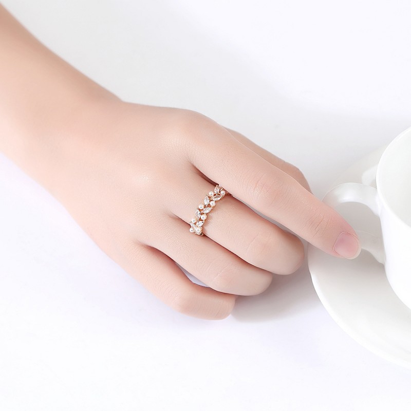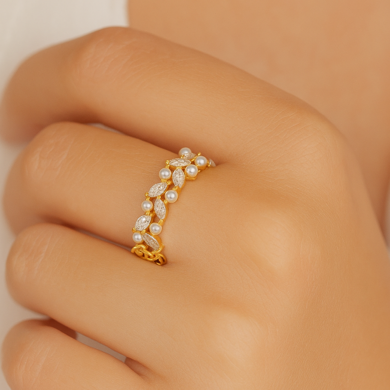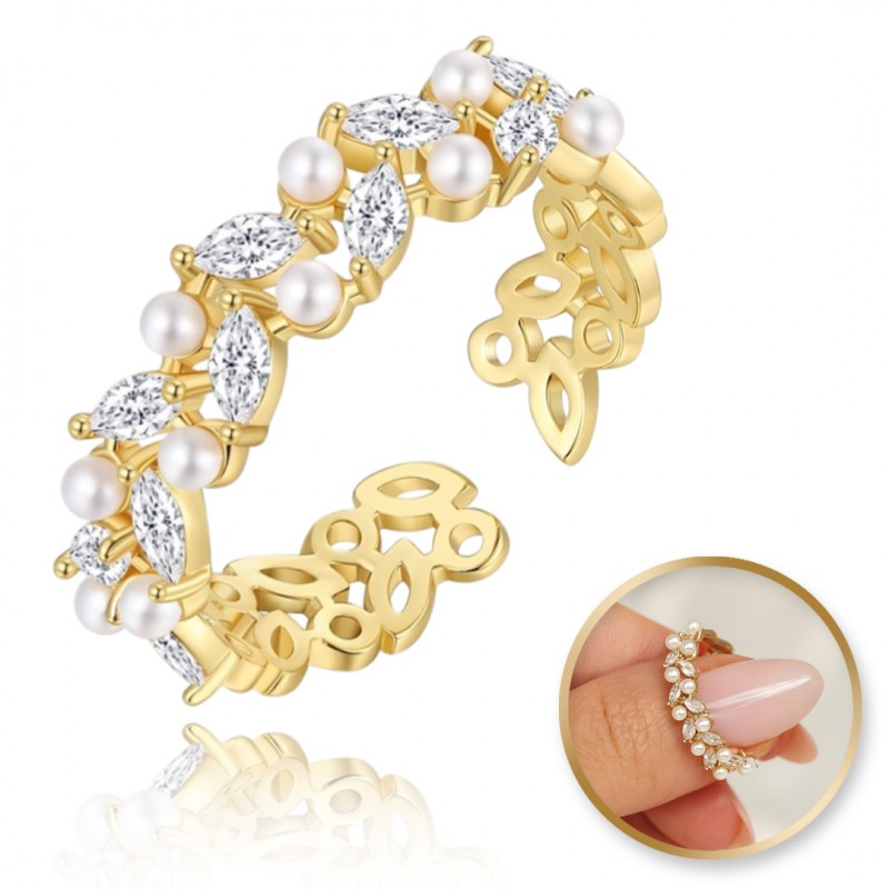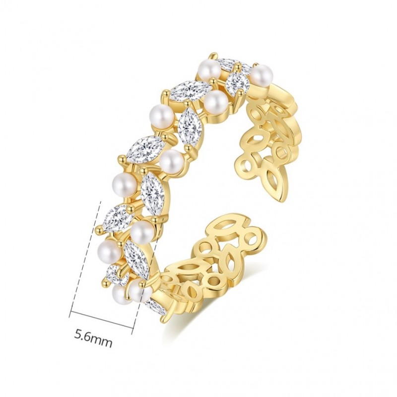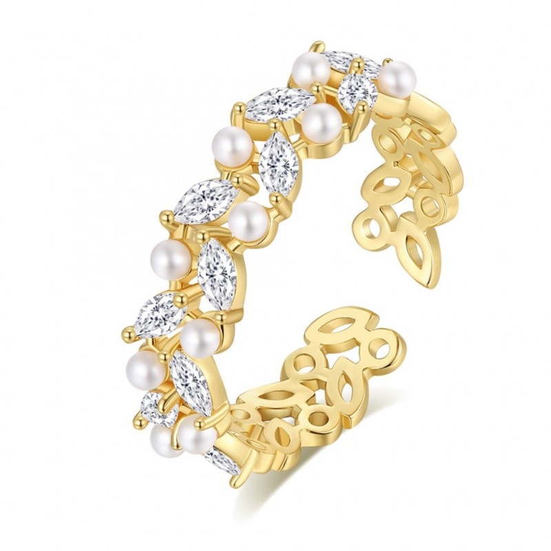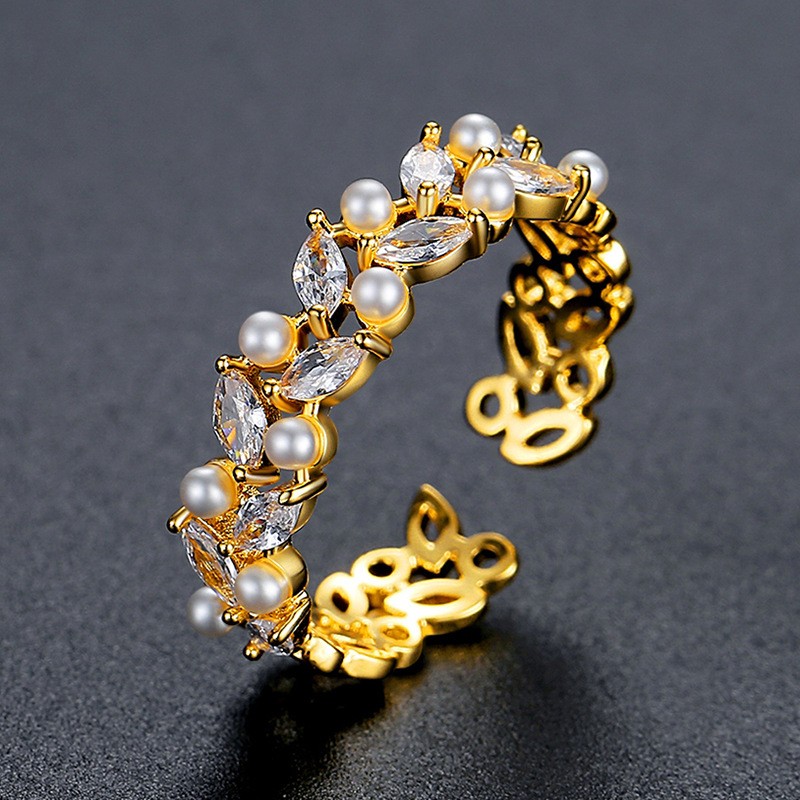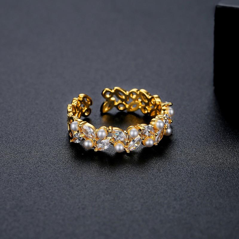 Pierścionek stal chirurgiczna platerowana złotem, z cyrkoniami i perłami PST934