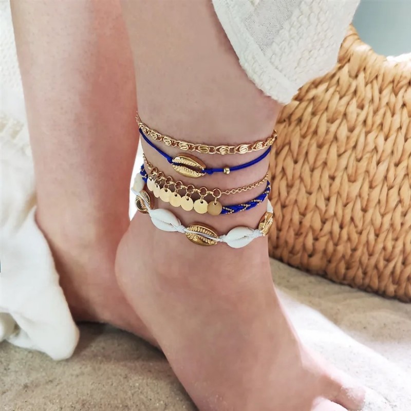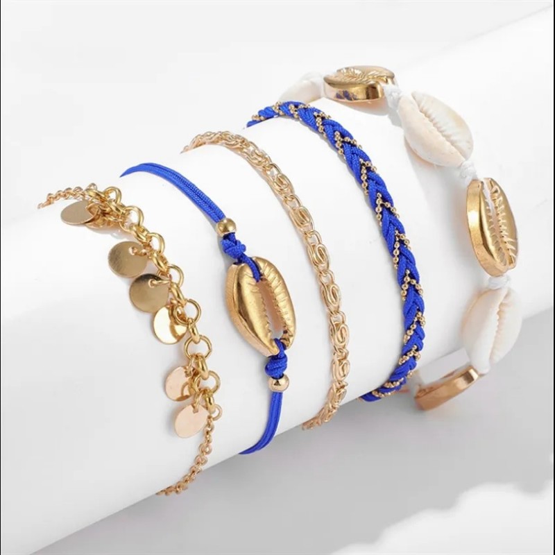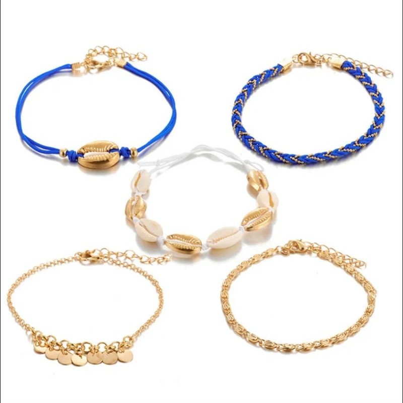 Zestaw bransoletek na stopę 5w1 niebieskie plecione muszelki B515